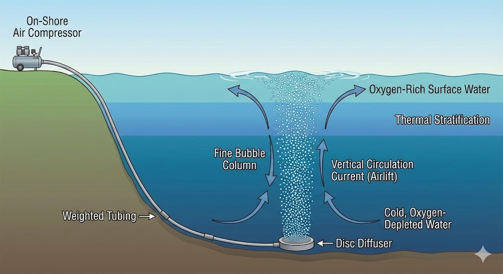 In Seen, die tiefer als 10 Fuß sind, muss ein Oberflächenbelüfter doppelt so stark arbeiten, um die gleiche Wassermenge zu bewegen. Ein Untergrunddiffusor nutzt die natürliche Physik von Auftrieb und Gasübertragung . Wenn Blasen aufsteigen, dehnen sie sich aus und vergrößern so die Oberfläche und die „Anziehungskraft“ der vertikalen Strömung ohne zusätzliche Energiekosten.