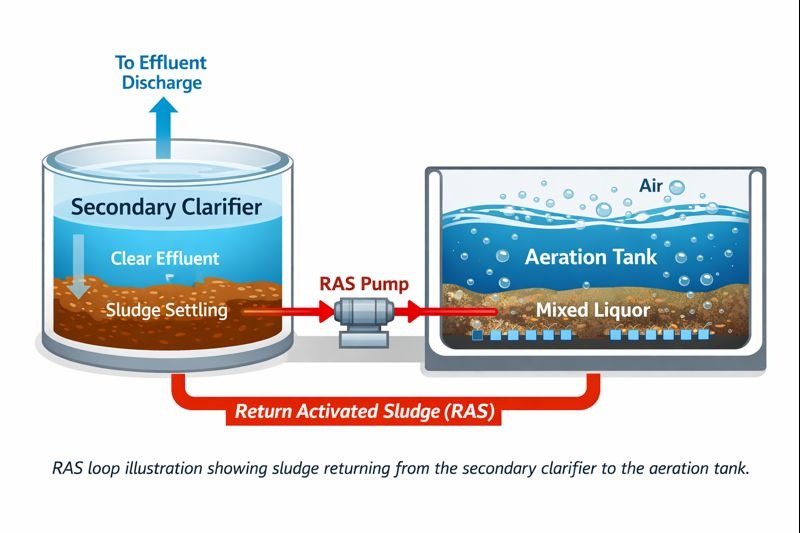RAS (Rücklaufschlamm) ist der Prozess der Rückführung von abgesetztem Belebtschlamm aus dem Nachklärbecken zurück in den biologischen Reaktor.