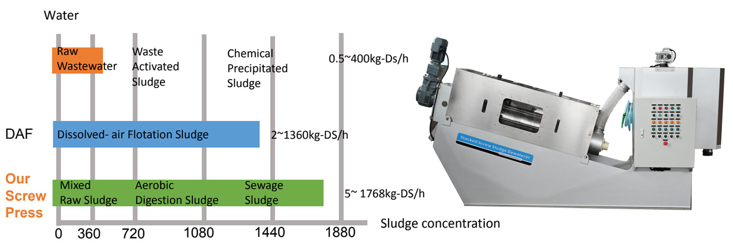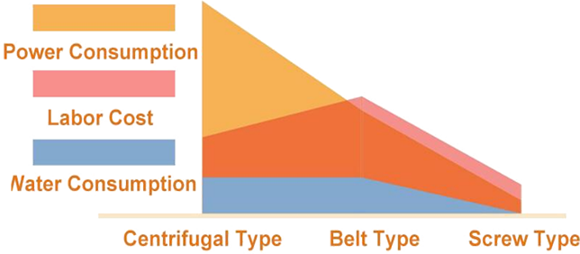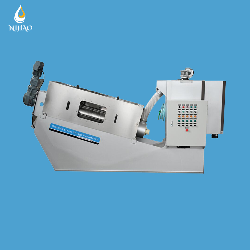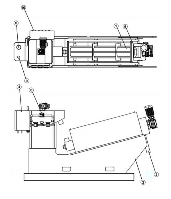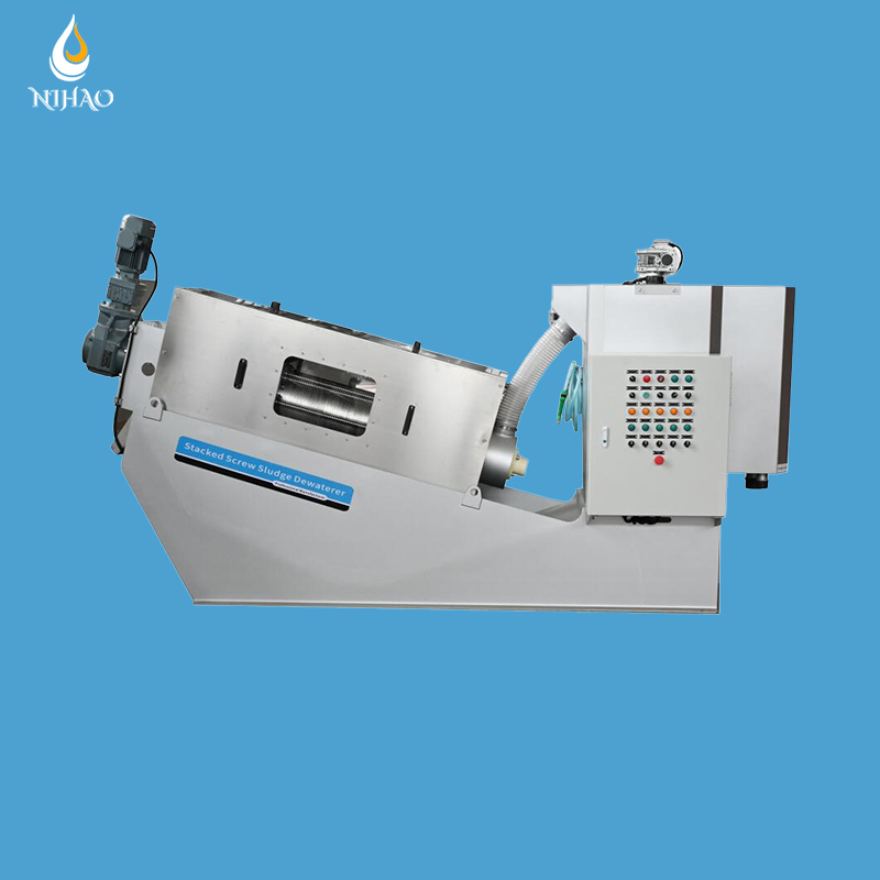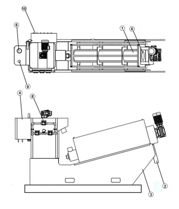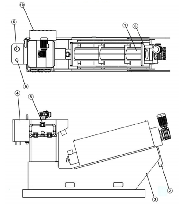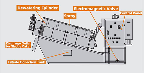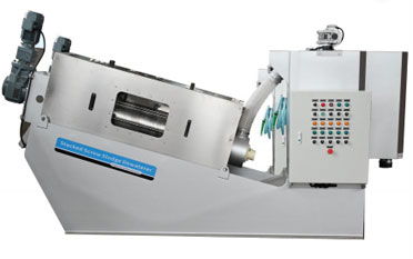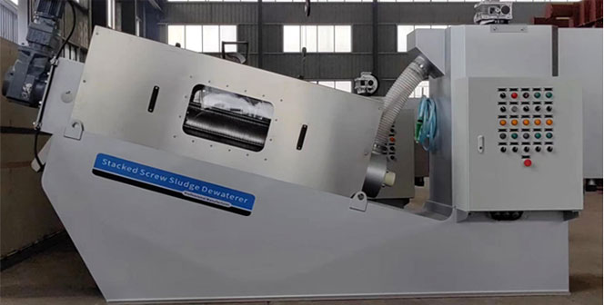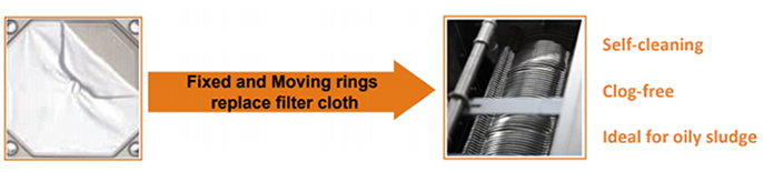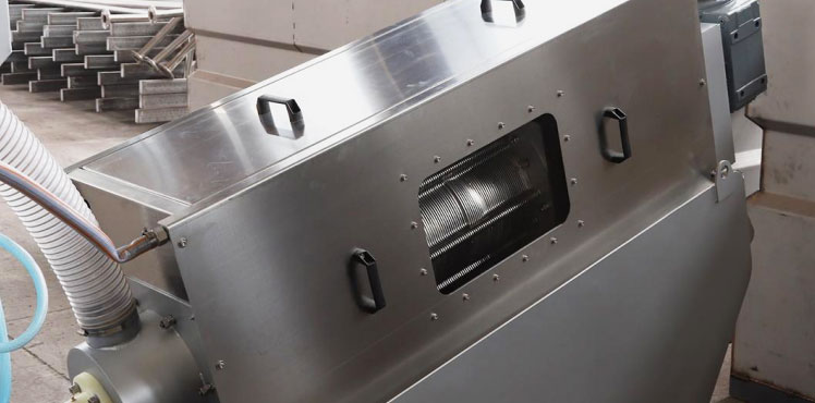 Eine Schlammentwässerungspresse vom Schneckentyp (Schneckenpresse) ist mit einem Filterelement ausgestattet, das aus zwei Arten von Ringen besteht: einem festen Ring und einem beweglichen Ring; und eine Schraube, die das Filterelement antreibt und den Schlamm transportiert und unter Druck setzt.