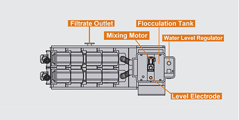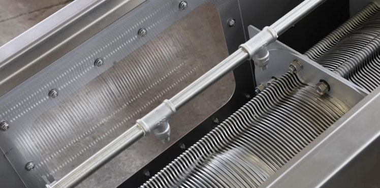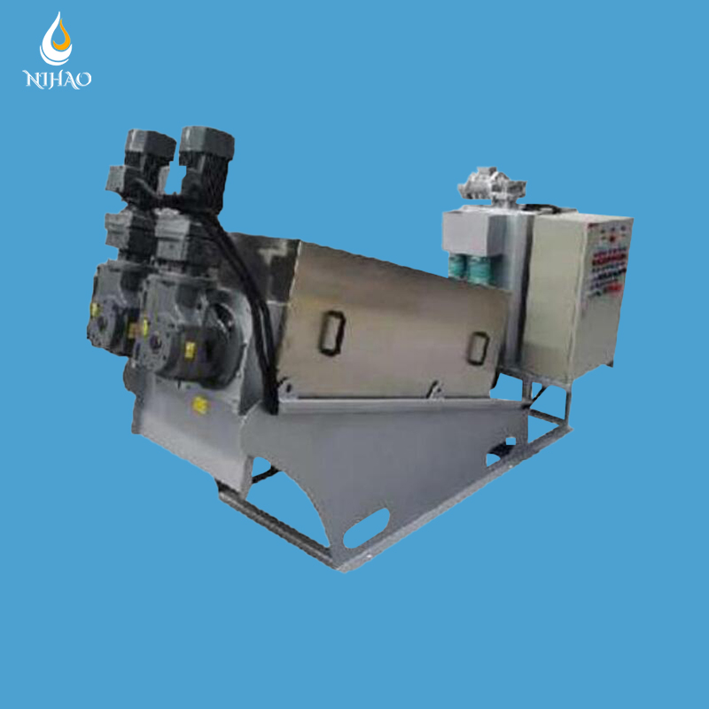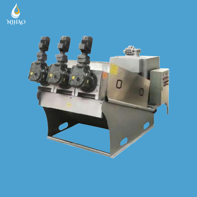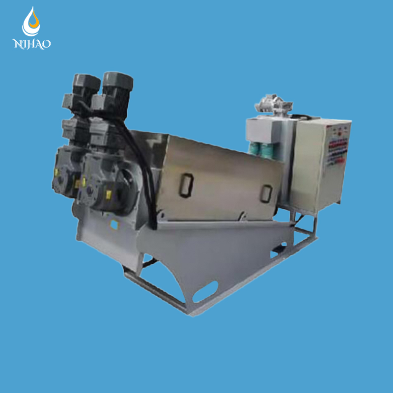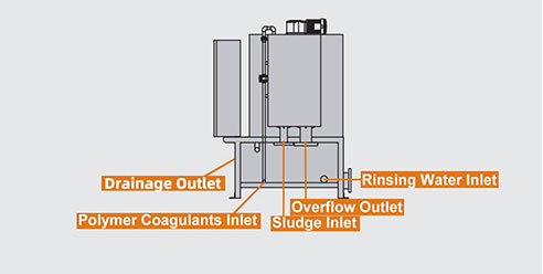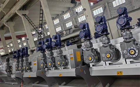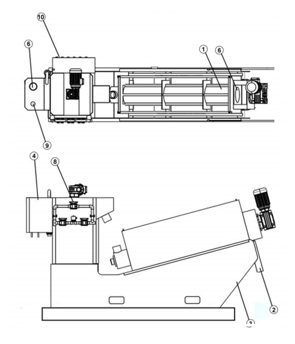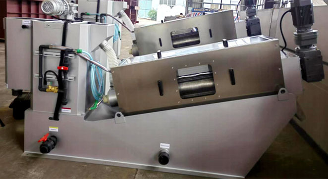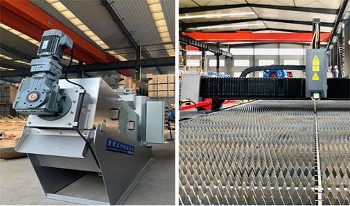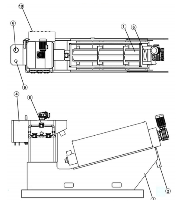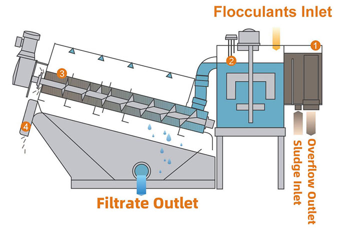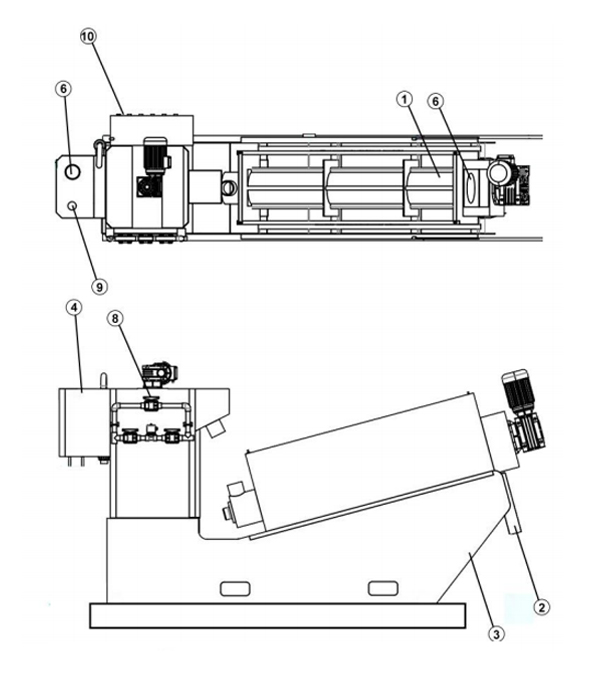 Eine Schlammentwässerungspresse vom Schneckentyp (Schneckenpresse) ist mit einem Filterelement ausgestattet, das aus zwei Arten von Ringen besteht: einem festen Ring und einem beweglichen Ring; und eine Schraube, die das Filterelement antreibt und den Schlamm transportiert und unter Druck setzt.